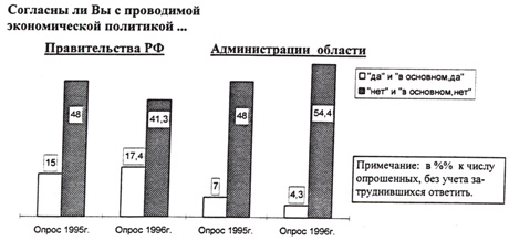 Как видим, значительная часть респондентов негативно оценила курс в экономике, проводимый Правительством РФ и Администрацией области. Не очень высокими оценками (в среднем 3,5 балла по 10-балльной шкале оценки) была отмечена предпринимателями и деятельность в 1995 году властных структур разных уровней управления (Президента РФ, Премьер-министра, Губернатора области, глав местных администраций).
