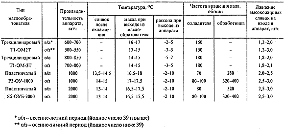 Параметры производства масла в цилиндрическом маслооб-разователе устанавливают в зависимости от химического состава жира и времени года (см. табл. 45). Для получения масла с хорошими показателями консистенции продолжительность обработки продукта в зоне кристаллизации должна составлять в весенне-летнее время 140-160, а в осенне-зимнее - 180-200 секунд. Более длительное перемешивание ведет к образованию излишне мягкой, нетермоустойчивой консистенции продукта. В этом случае следует увеличить подачу высокожирных сливок в аппарат или уменьшить подачу рассола в рубашку маслообразователя. При этом температура масла на выходе возрастает на 1-2 °С и оно приобретает более твердую консистенцию. И наоборот, при получении масла излишне твердой консистенции необходимо уменьшить производительность маслообразователя, уменьшив подачу высокожирных сливок в аппарат, и снизить температуру на выходе масла.