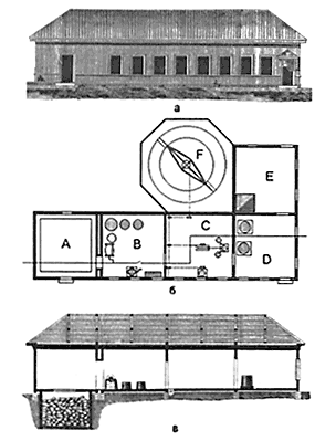 Рис. 2. Маслодельня Л. И. Буман (с. Фоминское Вологодской губернии и уезда): а - фасад, б - план, в - продольный разрез На плане: |