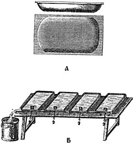 Гуссандеровский способ отличается от предыдущего тем, что отстаивание проводится в сухой светлой комнате при температуре 15-20 °С без предварительного охлаждения в ряде отстойных плоских (высота 15 см) продолговатых тазов (рис. 5, б), имеющих на днe замыкаемые отверстия. Тазы по 4 штуки устанавливаются на стол. Их отверстия в дне располагаются над узким жестяным желобом. Через 24 часа снимаются сливки: из каждого таза вытаскивается пробка, обезжиренное молоко по желобу стекает в ведро, а сливки, как более плотная часть, остаются в отстойных тазах, откуда их собирают.