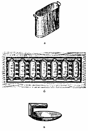 Рис. 7. Посуда для шварцевского метода: а - отстойный сосуд; б - приемник с одним рядом сосудов; в - ковш для снятия сливок |