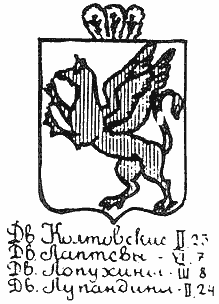 После Любима Пустошкина, имевшего чин бригадира, усадьбой Покровское владели его дочери - Елизавета Любимовна Пустошкина, девица, и Александра Любимовна Лупандина (урожденная Пустошкина), вдова полковника Лупандина. Несколько слов о Лупандиных. Один из них, С. М. Лупандин, был испомещен в Устюжнском уезде в конце XVI в. Он принадлежал к древнему дворянскому роду, который имел общие корни с Лопухиными и одинаковый герб (рис.1).