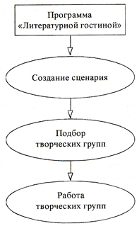 Поэтому основная форма работы по реализации программы «Литературной гостиной» — это синтез литературно-музыкальной и драматической композиции. Драматическая постановка продолжает собой литературную композицию (ее содержание продолжает общую тему). Вместе они создают целостное самостоятельное художественное произведение, результат которого намного выше.