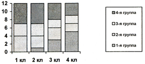 Принципы формирования групп различны и зависят от задач урока и особенностей конкретного класса. Сегодня группы были разделены достаточно случайно, так как для данного занятия это не было принципиально важно, но в каждой группе присутствовал один сильный в двигательном плане ученик. Такой принцип деления класса на отделения наиболее примитивен. Следует признать, что формирование групп является одним из самых сложных моментов в работе. Своей задачек я вижу помощь школьнику в объективной оценке своих сил. если это удается, то обычно не возникает проблем с формированием групп, и ученики имеют возможность проявить самостоятельность что выражается: