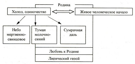 В начале стихотворения прослеживается нагнетание мрачных тонов. Небо, даль, туман — это Родина. При помощи данных ключевых слов и подобранных к ним эпитетов подчеркивается бесприютность русской зимней картины. Это ощущение безысходности смягчает в стихотворении сравнение тумана с чьей-то кроткой печалью — введение живого человеческого начала.
