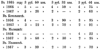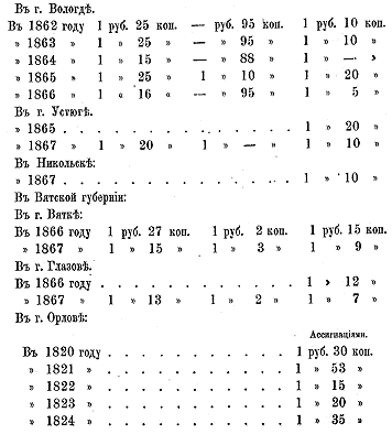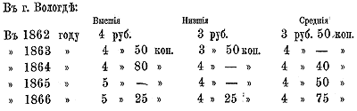 Сравнивая эти цены, получим для Вологодской губернии: Высшую 1 руб. 21 к., низшую 97 к., среднюю 1 р. 10 к.