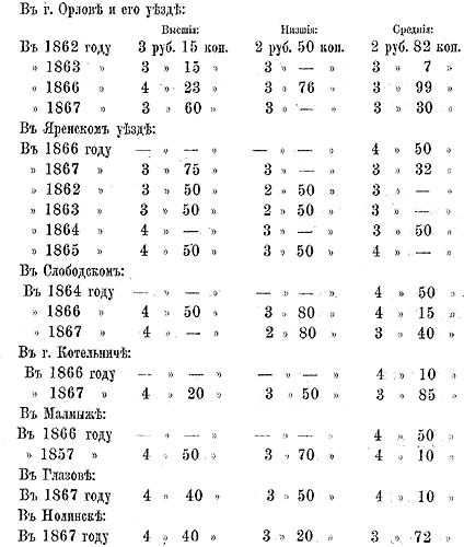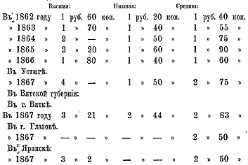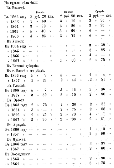 Сравнивая цены за весь этот период, получим, для Вологодской губернии, высшую 3 р. 89 к., низшую 2 р. 99 к. и среднюю 3 р. 40 к., и для Вятской губернии,—высшую 3 р. 67 к. низшую 2 р. 89 к. и среднюю 3 р. 29 к. за пуд.