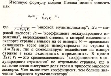 Передаточный механизм действует следующим образом. Национальный доход отдельной страны, получив положительный или отрицательный импульс от мирового хозяйства через ее экспорт, возвращает этот импульс на мировой рынок через сокращение или расширение ее импорта (с учетом временного лага). Поскольку сумма экспорта всех стран должна быть равна сумме их импорта, сумма изменений в импорте этих стран определяет сумму изменений в экспорте. Экспорт каждой страны определяется как функция объема мирового экспорта (или импорта). Но при этом воздействие изменения импорта отдельной страны на объем ее экспорта принимается незначительным.