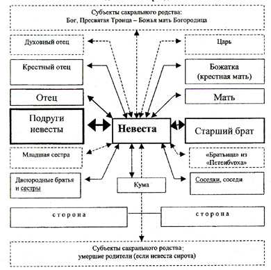 1. Пунктирные линии обозначают связи, не реализованные в обряде (персонажи лишь названы).
