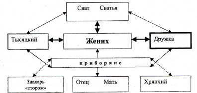 Участники свадебного обряда включаются в игру в установленной традицией определенной последовательности, образуют систему действующих лиц. Как партнеры по обрядовой коммуникации, они взаимосвязаны ролевыми правилами, составляют концептуальное единство.