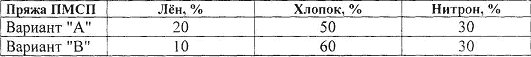 Влияние крутки на прочность пряжи достаточно хорошо известно. Однако характер этой зависимости для смешанной трёхкомпонентной пряжи пока что изучен недостаточно, тогда как это важно и для производителей пряжи, и для её потребителей. Ещё менее изучен вопрос о влиянии крутки на неровноту льносодержащей пряжи по разрывной нагрузке и по разрывному удлинению. Объектом нашего исследования была избрана опытная льносодержащая пряжа пневмомеханического способа прядения (ПМСП), выработанная из трёхкомпонентной смеси по двум вариантам. Процентное соотношение смешиваемых волокон показано в таблице 1.