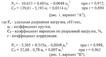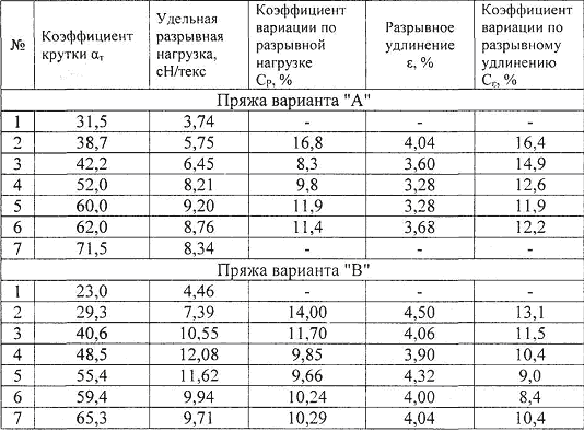 На рис.1 показаны графики изменения удельной разрывной нагрузки пряжи и неравномерности по прочности, а в табл.3 и 4 - показатели разрывного удлинения и неравномерности по разрывному удлинению образцов пряжи обоих вариантов, свидетельствующие о наличии зоны оптимальных круток, обеспечивающих получение пряжи с пониженной неравномерностью разрывных характеристик.