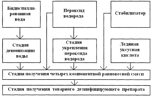 Процесс получения равновесной смеси надуксусной кислоты и пероксида водорода идет достаточно легко (при соблюдении всех основных технологических требований) без перемешивания (т.е. процесс протекает в диффузионной области). Равновесные концентрации устанавливаются через 10-20 дней с момента начала реакции, после чего полученную смесь пероксидных соединений можно разливать в специально подготовленную тару и поставлять потребителю.