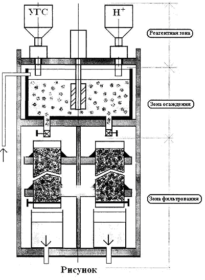 Новизна оборудования заключается в создании передвижного модуля, состоящего из трех основных зон (реагентная зона, зона осаждения и зона фильтрации) и представляющего собой передвижной колонный аппарат, в котором основные зоны конструктивно и технологически связаны массообменными и тепловыми потоками.