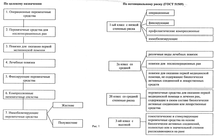 Разработанная Институтом хирургии им. А.В.Вишневского РАМН классификация перевязочных средств (рис. 1-2) принята как руководство при разработке текстильной основы и носителей для перевязочных средств. А в качестве основного материала принят, разработанный и запатентованный ФГУП ЦНИИЛКА «Влагопоглощающий материал» патент РФ №2145369 от 22.04.99 г. Техническое решение по этому патенту дает возможность составлять для текстильных носителей перевязочных средств льносодержащие смески с заданными гигроскопическими и физико-гигиеническими свойствами: поглотительной способностью, капиллярностью, способностью угнетать жизнедеятельность микрофлоры.