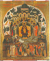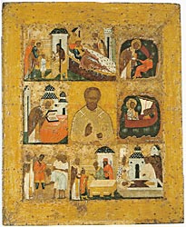Особой любовью у вологжан пользовалась икона Николы Великорецкого (илл. 59), образ которого стал почитаться на Руси после победоносного завершения Иваном Грозным походов на Казань. По местным легендам, древняя вятская икона святого Николая Чудотворца с житием, явившаяся в 1383 году на реке Великой близ Хлынова (Вятки), спасла Вологду от нашествия татар. В 1555 году, по желанию Ивана IV, чудотворный образ был перенесен в Москву, где икону, пострадавшую от пожара 1544 года, поновил московский митрополит Макарий. В честь этого образа был освящен один из приделов храма Покрова на Рву, а списки с него разослали в Вологду, Тотьму и другие города. Создание иконы Николы Великорецкого для Вологды происходило при участии местного епископа Киприана (1547-1588), жизнь которого долгое время была связана с Москвой.