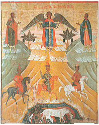 В средней части иконы изображены скачущие друг за другом всадники — каппадокийские конюхи Спевсипп, Елевсипп и Мелевсипп, чьи имена в переводе с греческого означают: «ускоряющий бег коня», «гонящий коня», «ухаживающий за конем». Помещенные внизу на темно-синем фоне озера разноцветные кони производят необычайно нарядное, почти сказочное впечатление.