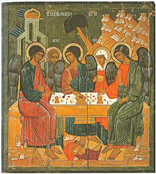 Характерным примером работы местного мастера второй половины XVI века является икона «Святая Троица» (илл. 61), происходящая из Екатерининской церкви в Вологде. Приземистые пропорции, тяжелые, чуть одутловатые лики, упрощенный стилизованный рисунок черт и драпировок, плотные интенсивные локальные цвета позволяют сблизить этот памятник с так называемыми «северными письмами».