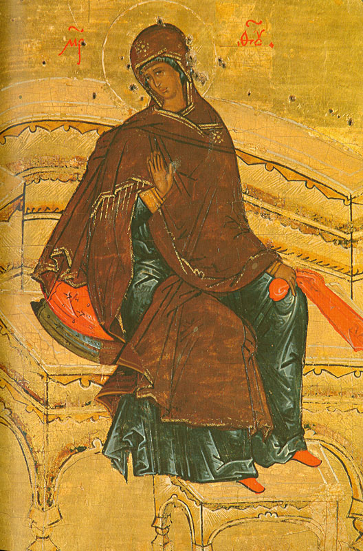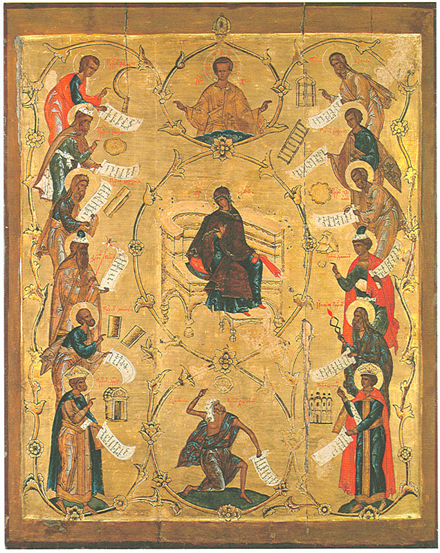 В центре иконы изображена Богоматерь на престоле в обрамлении стебля золотистой лозы. Над ней в таком же обрамлении — поясное изображение Христа Эммануила. По сторонам от Богоматери мастер изобразил по шесть фигур пророков со свитками и символами пророчеств: Захарии — с серпом, Иезекииля — с вратами, Иакова — с лествицей, Даниила—с горой, Моисея — с купиной, Давида — с ковчегом Завета и т. д. Последнего, тринадцатого, пророка Валаама он поместил внизу, также окружив его лозой. Уникальность иконографии этого памятника заключается в присутствии пророка Иоиля, изображенного вторым сверху в левом ряду. Текст на его свитке гласит: «Иоиль рече: исторгните серца ваши, а не ризы ваши» (Ил. II, 13), а в качестве символа пророчества перед ним изображено сердце.