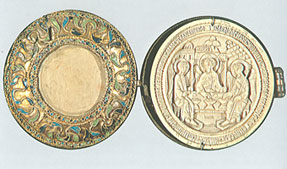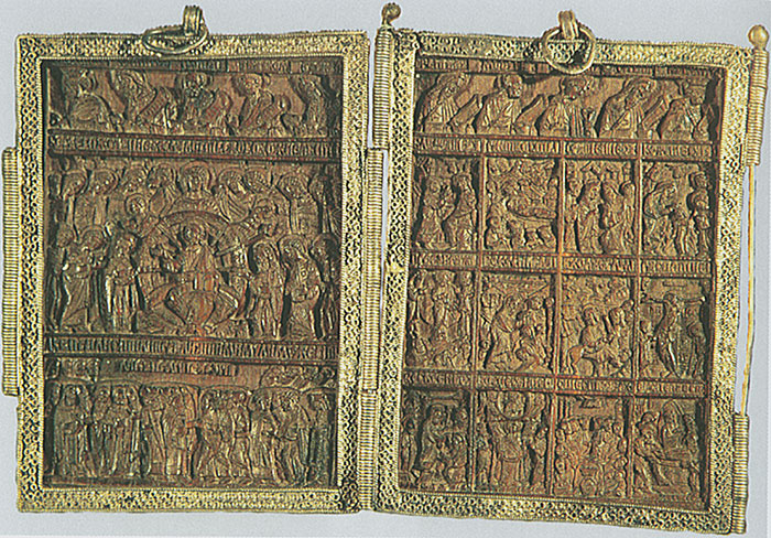 Такие резные иконы помещались в храмах в раскрашенные киоты. Оба произведения расписаны темперными красками, причем письмо ликов, складок одежд и орнамента исполнено традиционными иконописными приемами. Это позволяет предположить, что над росписью резных деревянных фигур святых работали иконописцы. Произведения мелкой пластики XVI века (илл. 71-73) отличаются миниатюрной разработкой многофигурных сцен, тонкой резьбой по дереву, кости, мастерски выполненной гравировкой и чернением по серебру.