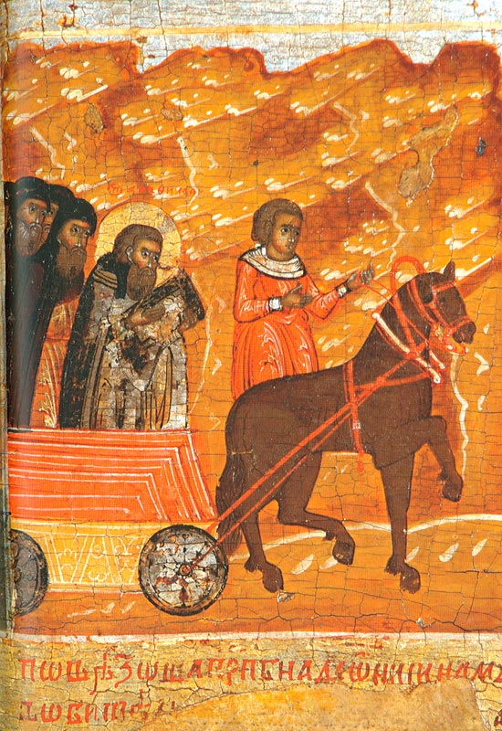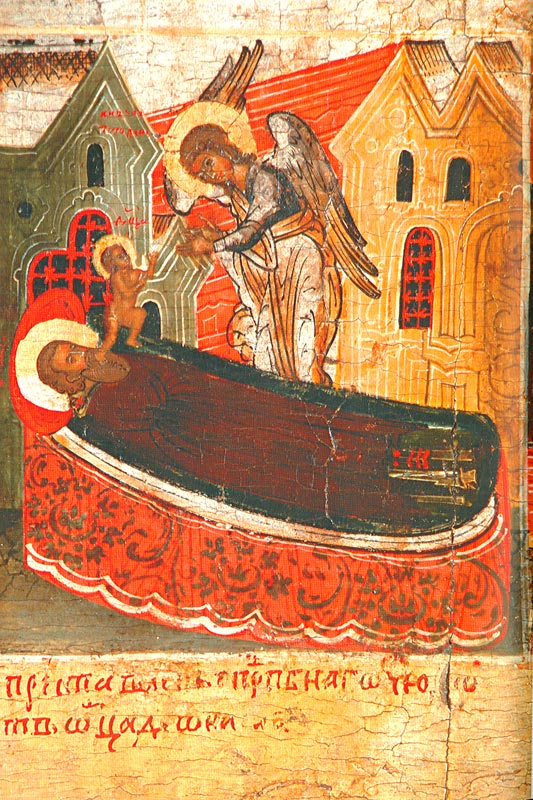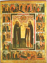В XVII столетии на Севере получают широкое распространение житийные иконы, посвященные местным святым. Из вологодской церкви Петра и Павла происходит большая житийная икона преподобного Павла Обнорского (илл. 98-100), основателя Троицкого Павло-Обнорского монастыря. В среднике этой иконы, созданной во второй половине XVII века, помещен суровый и аскетичный образ преподобного Павла. Цветовая гамма произведения приглушена, колорит строится на сочетании землисто-коричневых, темно-красных и густых синих тонов. Клейма иконы повествуют о нелегкой жизни и трудах монахов-подвижников, основателей северных монастырей.