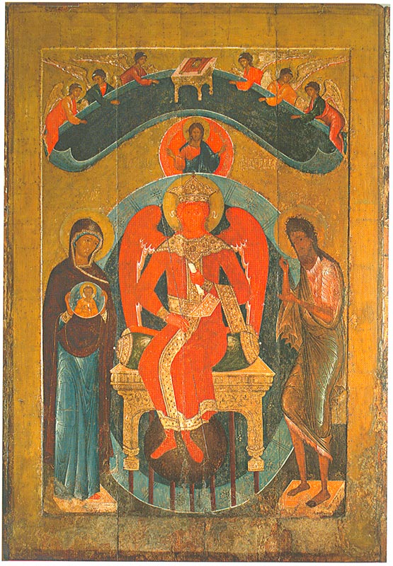 В центре иконы из Софийского собора представлен огромный огневидный ангел в царских одеждах, изображающий Софию Премудрость. Это символический образ царствующего над Вселенной Бога Слова, восходящий к образу Ангела Великого Совета из пророчества Исайи (Ис. IX, 6).