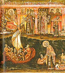 112. Преподобные Зосима и Савватий, с видом Соловецкого монастыря. Деталь |