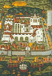 Некоторые из этих качеств отразились в иконе второй половины XVII века «Вход в Иерусалим» (илл. 104) из вологодской церкви Спаса на Болоте. На этой иконе Иерусалим представлен в виде чудесного многобашенного города. В его декоративной и красочной архитектуре формы западноевропейского происхождения сочетаются с элементами, типичными для более ранней русской иконописи. Особенности личного письма указывают на знакомство иконописца с творчеством мастеров Оружейной палаты, хотя в целом лики этой вологодской иконы не являются точным воспроизведением более натуралистической, «живоподобной» манеры письма столичных изографов.