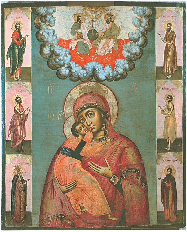 Великоустюжский мастер Борис Деомидов в 1707 году написал икону «Богоматерь Владимирская с избранными святыми» (илл. 114). Икона создана по «обещанию Соли Вычегодской жителю Семену Григорьеву сыну Телятеву». В среднике на зеленом фоне помещен образ Богоматери Владимирской и Новозаветной Троицы в облачной полусфере. На полях иконы узкими полосами располагаются розовые клейма с избранными святыми в молитвенных позах. Это Симеон Богоприимец, Алексий человек Божий, Прокопий и Иоанн Устюжские, великомученица Екатерина и преподобная Феодора. Зеленый фон и тщательная светотеневая моделировка ликов свидетельствуют о том, что мастер следовал манере иконописцев Оружейной палаты, хотя сами фигуры святых решены в более плоскостной манере.