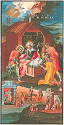 К этому направлению принадлежат произведения иконописца Димитрия Сумарокова, имя которого часто встречается в вологодских документах этого периода. Известно, что в 1750-х годах Сумароков выполнял заказы Архиерейского дома и Вологодской консистории. В экспозиции находится его икона «Рождество Христово» 1785 года (илл. 123), написанная для вологодской Ильинской церкви.
