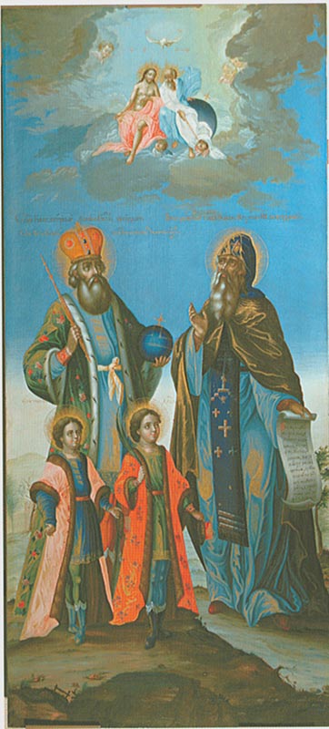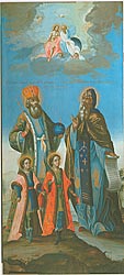 В живописно-объемной манере выполнена икона последней четверти XVIII века «Ярославские чудотворцы князья Феодор, Давид и Константин и преподобный Максим Исповедник» (илл. 124) из церкви Димитрия Прилуцкого на Наволоке. Святые, изображенные на фоне пейзажа, возводят очи к небу, где на облаках восседают Бог Отец и Бог Сын.
