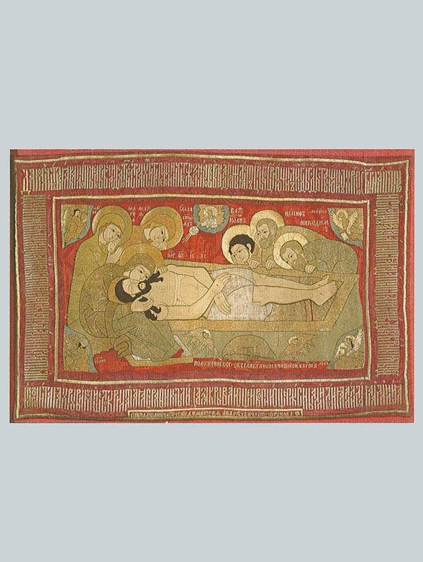 Кроме икон XVII—XVIII веков, в собрании музея находится несколько интересных памятников лицевого шитья этой эпохи. В 1662 году в мастерской Анны Ивановны Строгановой была вышита плащаница с изображением Положения во гроб (илл. 125), которая поступила в музей из вологодского Софийского собора. В этот период сольвычегодская мастерская именитых людей Строгановых была одной из лучших в России. Плащаница шита по камке. В ее среднике представлен лежащий во гробе Христос, голова которого покоится на коленях Богоматери, сидящей у изголовья и оплакивающей своего Сына. Рядом с ней стоят Марфа и Мария Магдалина, а у ног Христа изображены скорбящие Иоанн Богослов, Иосиф Аримафейский и Никодим. Над гробом в сегменте неба представлен Господь Саваоф, из уст которого исходит луч со Святым Духом в ореоле. По углам в сегментах вышиты символы евангелистов Матфея (ангел), Марка (орел), Иоанна (лев) и Луки (телец). На кайме размещены литургический текст и вкладная надпись: «СИЯ ПЛАЩАНИЦА СТРОЕНИЕ ДИМИТРИЯ АНДРЕЕВИЧА СТРОГАНОВА». Плащаница была даром Строгановых вологодскому архиепископу Маркеллу.
