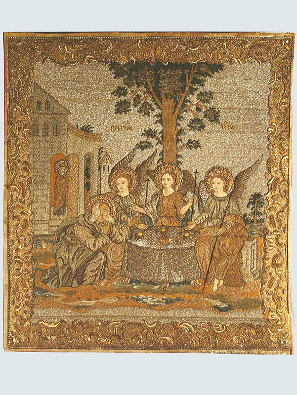 Небольшая шитая икона «Троица Ветхозаветная» датируется 1804 годом (илл. 126). Изображение вышито на белой шелковой ткани, прикрепленной к льняной основе. В шитье использованы цветные шелковые и золотные нити, канитель и бить. Композиция обрамлена широкой каймой с орнаментом, вышитым золотными нитями «по карте» швом «в прикреп», который создает рельефный узор, состоящий из стилизованных веточек и завитков. Приемы шитья выявляют пластику фигур, придают им объемность, «живописность». Эмоциональное состояние персонажей передается мимикой, жестами и позами, напоминающими произведения второй половины XVIII века. Вероятно, икона повторяет более ранний образец. Надпись на основе в нижней части иконы указывает имя вкладчицы - Евдокии Григорьевны Булдаковой, дочери иркутского купца Григория Шелихова, которая в пятнадцать лет была выдана замуж за великоустюжского купца Михаила Булдакова. По мнению исследователей, это произведение было создано в великоустюжских монастырских мастерских и вложено в Христорождественский храм Великого Устюга как моление о благополучном возвращении мужа старшей сестры Евдокии Анны из кругосветного путешествия, которое он совершил в 1803-1805 годах.