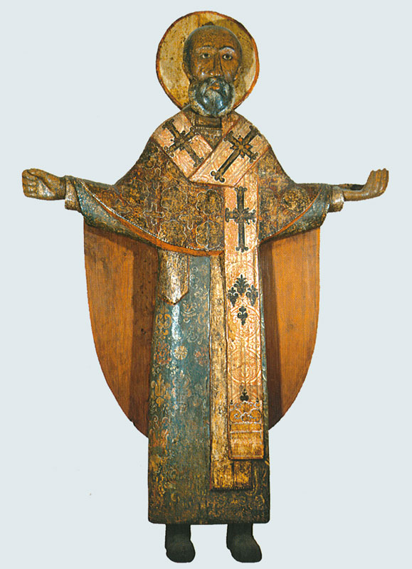 Искусство деревянной скульптуры в последнем разделе экспозиции представлено резным изображением Николы Можайского, относящимся к XVIII веку. Оно восходит к скульптурному изображению XIV века, находившемуся в Можайске и почитавшемуся как чудотворный образ. Резные фигуры Николы Можайского были широко распространены в русском искусстве XVI—XVIII веков. Несмотря на то, что в эпоху Петра I резные образа считались не соответствующими канонам православия и изымались из храмов, эта древняя традиция сохранила свое былое значение, и северные мастера продолжали создавать резные образы почитаемых святых.