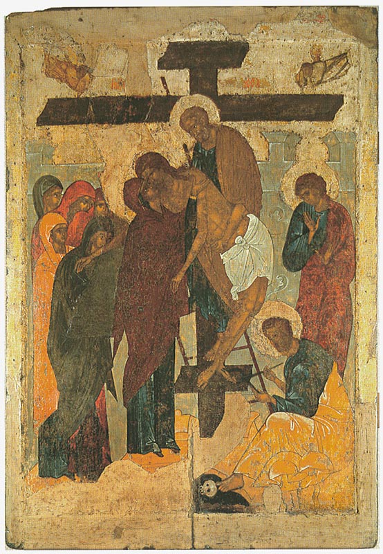 В центре композиции «Снятие со креста» изображены Богоматерь и стоящий на лестнице Иосиф Аримафейский, поддерживающие тело распятого Спасителя. У ног Иисуса представлен Никодим, вынимающий длинными клещами гвозди из Его ступней, а по сторонам от креста — иерусалимские жены и апостол Иоанн Богослов.