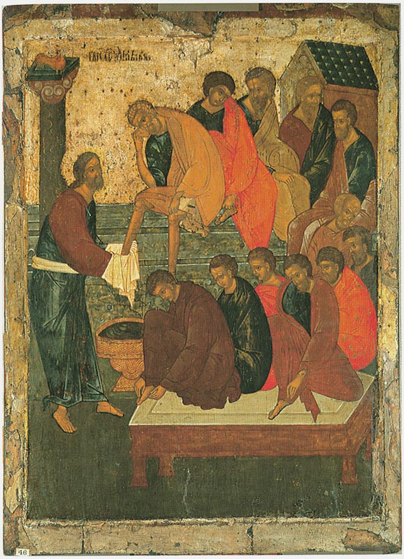 Икона «Омовение ног» иллюстрирует евангельский рассказ о том, как Христос перед пасхальной трапезой омыл ноги апостолам, дав им заповедь смирения, любви и взаимного служения: «Итак, если Я, Господь и Учитель, умыл ноги вам, то и вы должны умывать ноги друг другу» (Ин. XIII, 14). На иконе в левой части у чаши с водой изображен Христос, опоясанный полотенцем, концами которого он утирает ноги апостолу Петру.