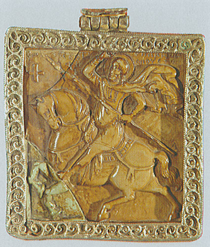 В числе ранних памятников мелкой пластики, представленных в экспозиции, необходимо отметить небольшую икону Евстафия Плакиды XIV века в серебряной оправе, выполненную из серо-зеленого камня (илл. 30). Она также происходит из Спасо-Каменного монастыря. По преданию, Евстафий во время охоты увидел оленя с крестом между рогами и услышал голос, повелевавший ему принять крещение. Святой изображен на коне с копьем в левой руке. Поднятая вверх правая рука всадника знаменует крайнее удивление. В сегменте неба слева вверху изображен крест, напоминающий о видении святого. Судя по характеру резьбы с мягко-округлыми линиями икона, вероятно, является работой московских мастеров. В то же время некоторые исследователи выдвигают версию о византийском происхождении этого памятника.