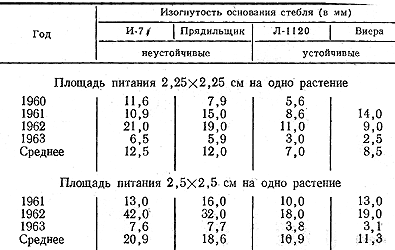 Специальный опыт, проведенный во Всесоюзном научно-исследовательском институте льна (Ю. И. Рогаш) в течение 1960—1963 гг., показал, что сорта льна-долгунца Л-1120 и Виера, характеризующиеся в производстве и по данным государственного сортоиспытания как устойчивые к полеганию, имели значительно меньшую изогнутость основания стебля, чем сорта И-7, Прядильщик, Стахановец, 806/3 и другие, неустойчивые к полеганию. Такие данные получены при выращивании растений в сосудах Митчерлиха, в деревянных ящиках, а также в полевых условиях даже при поддержании растений от полегания каркасами или горизонтальными сетками, применяемыми в опытах (табл. 23) (рис. 15).