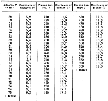 Значения слагаемых по гибкости волокна свыше 52 мм и по тонине свыше 210 мм приведены в таблице 24. Если найденное значение тонины в таблице отсутствует, находят соответствующее ему слагаемое интерполяцией из соседних значений.