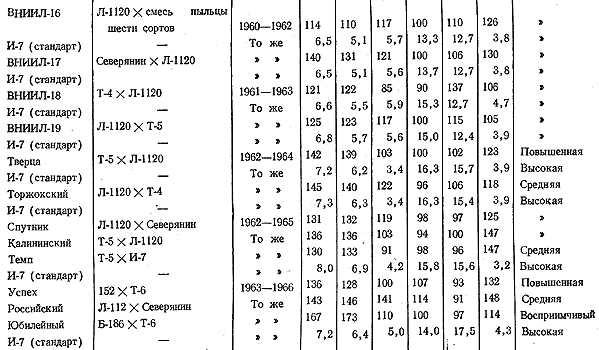 Во Всесоюзном научно-исследовательском институте льна за 1958—1966 гг. выведено и передано в государственное сортоиспытание 26 новых сортов льна-долгунца. Из них продолжают испытываться следующие сорта: ВНИИЛ-8, ВНИИЛ-9, ВНИИЛ-11, ВНИИЛ-12, ВНИИЛ-13, ВНИИЛ-14, ВНИИЛ-16, ВНИИЛ-17, ВНИИЛ-18, ВНИИЛ-19, Тверца, Торжокский, Калининский, Спутник, Темп, Юбилейный, Российский и Успех (табл. 27).