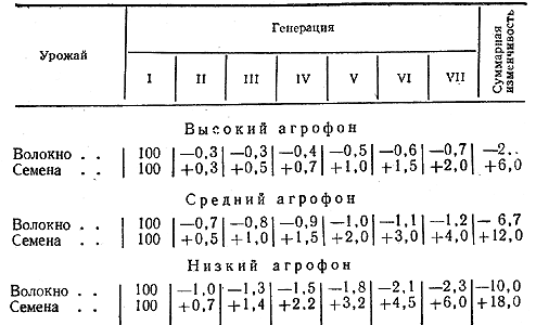 Исследованиями, проведенными в 1955—1960 гг. в Украинском научно-исследовательском институте земледелия (Т. С. Аниськова) было установлено следующее. При выращивании сорта льна-долгунца Светоч на протяжении пяти лет в условиях ежегодно накладывающегося оптимального загущения в широкорядных (междурядья 45 см, 200 семян на погонный метр рядка) и узкорядных (междурядья 10 см, 250 семян на погонный метр рядка) посевах потомства растений по основным хозяйственно ценным признакам — высоте, диаметру стебля, числу коробочек на растении, весу 1000 семян и другим существенно не различались между собой. В таких условиях у растений не наблюдалось нежелательных изменений наследственных признаков.