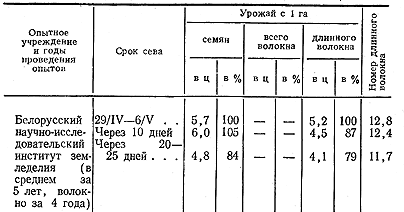 Однако в некоторые годы метеорологические условия складываются в пользу поздних сроков сева, так как иногда резко отклоняются от средних многолетних данных. Они могут оказаться благоприятными в период быстрого роста льна для поздних сроков сева и тогда урожай льнопродукции может быть выше, чем при посеве в ранние сроки. Так, на бывш. Льняной опытной станции ТСХА первое и второе место по урожаю соломы и волокна занимали первый и второй сроки сева в течение 9 лет из 15, а третий, четвертый и пятый сроки — первое место в течение 6 лет. В опытах ВНИИЛ из трех лет изучения сроков сева два года более высокий урожай волокна был получен при раннем сроке сева, а один год — при позднем (1956 г.). То же наблюдалось и в опытах Смоленской сельскохозяйственной опытной станции в 1958 г.