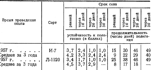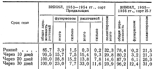 В опытах Ленинградского сельскохозяйственного института (Г. П. Соловьева, 1951 — 1960 гг.) поражаемость растений сорта 1288/12 фузариозом при ранних сроках сева по сравнению с поздними снижалась в 1,5 — 2 раза, а сорта Л-1120 — фузариозом в 3 раза, полиспорозом— в 1,5—2 раза.