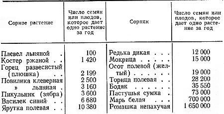 Большая засоренность посевов объясняется рядом причин, одна из которых — громадная плодовитость сорняков. Если одно растение льна может в течение лета дать 400—500 семян, а озимые зерновые до 2000, то одно сорное растение может образовать десятки и сотни тысяч семян (табл. 75).