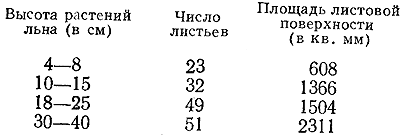 Данные ВНИИЛ (А. Д. Сазонова) показывают, что у растений льна высотой 4—15 см количество листьев и площадь их значительно меньше, чем у растений, имеющих высоту 18—40 см.