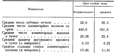 Как показали исследования Н. Г. Абрамова, на месте изгиба третья часть или половина окружности у изогнутого стебля имеет нормальные лубяные пучки, в которых элементарные волокна плотно прижаты один к другому, имеют толстые стенки и небольшие просветы. На остальной части окружности стебля лубяные пучки вытянуты, элементарные волокна неплотно прилегают, имеют большой просвет и тонкие стенки, что является причиной искривления стеблей (табл. 77). Точно так же увеличивается количество искривленных стеблей при опрыскивании неровного по высоте льна по сравнению со своевременной обработкой гербицидами выравненного льна.