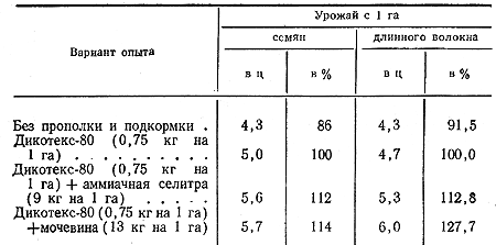 Совместное внесение дикотекса-80 (0,6 кг на 1 га) и борнодатолитового удобрения (7,5 кг тука на 1 га) повысило урожай по сравнению с опрыскиванием одним дикотексом-80 семян на 0,6 ц с 1 га и всего волокна на 0,7 ц с 1 га, в том числе длинного на 0,8 ц.