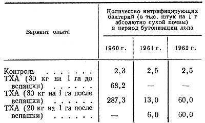 Эффективность трихлорацетата натрия еще больше возрастает, так как увеличиваются прибавки урожая следующей за льном зерновой культуры. По данным ВНИИЛ, прибавка урожая зерна от ТХА, внесенного под лен, в последействии составляла до 3 ц с 1 га зерна ячменя (в 1961 г.) и овса (в 1963 г.).