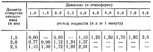 Чтобы выяснить, какое установить давление в соответствии с полученным расчетом расхода жидкости в минуту, можно пользоваться таблицей 91 (составлена по материалам М. А. Рыжей, И. Н. Белецкого), пригодной для всех штанговых опрыскивателей, используемых на обработке льна.