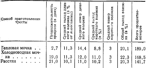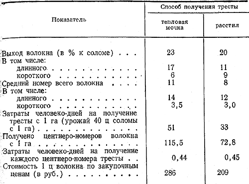 Опыт применения тепловой мочки льна в колхозе показал, что благодаря сокращению сроков приготовления тресты колхоз может раньше приступить к сдаче продукции, резко уменьшается потребность в стлищах. При переработке моченцовой тресты увеличивается выход длинного волокна. Однако затраты труда меньше при расстиле. На получение тресты из 1 т соломы способом тепловой мочки колхоз затрачивал 9,68 человеко-дня и
